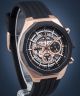 Zegarek męski Maserati Stile Skeleton Chronograph R8871642003 działa w oparciu o japoński mechanizm kwarcowy Miyota JS25. W kopercie z powłoką PVD w kolorze różowego złota osadzono skeletonową tarczę z datownikiem dni miesiąca i chronografem. Indeksy i wskazówki pokryto powłoką luminescencyjną. Całość uzupełnia czarny pasek z silikonu. Wodoszczelność modelu wynosi 10 ATM.