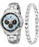 Zegarek męski Maserati Successo Chronograph SET R8873621045 oferowany jest w zestawie z dodatkową bransoletką, dzięki czemu doskonale sprawdzi się jako elegancki prezent. Model wyposażono w mechanizm kwarcowy Miyota JS25 oraz funkcję chronografu, pozwalającą na pomiar odcinków czasu. Koperta ze stali szlachetnej o średnicy 42 mm połączona jest ze srebrną bransoletą, tworząc spójną, nowoczesną całość. Na tarczy znajduje się datownik dni miesiąca, a szkło mineralne zabezpiecza powierzchnię zegarka. Wodoszczelność 50 metrów chroni go przed zachlapaniami. Całość uzupełnia 2-letnia gwarancja producenta.