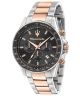 Maserati Sfida Chronograph R8873640009 to propozycja męskiego zegarka kwarcowego, który wyposażony został w stalową bransoletę w modnych odcieniach srebra i różowego złota, srebrną obudowę ze stali oraz czarną tarczę schowaną pod szkłem mineralnym. Na cyferblacie znajdują się datownik dni miesiąca oraz subtarcze chronografu i czas dobowego.