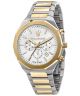 Maserati Stile Chronograph R8873642009 to męski zegarek kwarcowy, który wyróżnia się elegancką kopertą i bransoletą w srebrno-złotym kolorze, wykonanymi ze stali szlachetnej. Biała tarcza z giloszowanymi subtarczami dodaje mu wyrafinowanego stylu, a funkcje chronografu i 24-godzinny format czasu zwiększają jego funkcjonalność. Powłoka luminescencyjna na wskazówkach i indeksach zapewnia doskonałą widoczność w ciemności. Mechanizm japoński gwarantuje precyzyjne działanie, a mineralne szkło chroni tarczę przed zarysowaniami. Wodoszczelność do 100 metrów czyni ten model idealnym na co dzień oraz do eleganckich stylizacji.