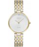 Zegarek Obaku Classic V256LXFISF to elegancki model o subtelnym charakterze. Koperta w złotym kolorze o średnicy 32 mm została zestawiona z bransoletą typu bikolor, łączącą srebro i złoto w spójną całość. Tarcza ozdobiona delikatnym fakturowaniem wyróżnia się minimalistycznym stylem, a jej górną część zdobi niewielki kryształek, który dodaje biżuteryjnego akcentu. Mineralne szkiełko chroni zegarek, a za jego pracę odpowiada mechanizm kwarcowy. Wodoszczelność na poziomie 30 metrów zabezpiecza przed drobnymi zachlapaniami.