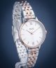 Zegarek damski Pacific X PC00299 utrzymano w kolorach srebrna i różowego złota. Kopertę wykonano z mosiądzu i połączono z bransoletą ze stali szlachetnej. Białą tarczę zabezpieczono szkiełkiem mineralnym. Model do pracy napędzany jest przez mechanizm kwarcowy.