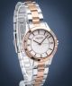 Pacific X PC00537 to połączenie srebra i różowego złota, napędzane japońskim mechanizmem kwarcowym Miyota 2035. Ten damski zegarek wyróżnia się zdobioną giloszowaniem tarczą z kryształowymi indeksami. Połyskujące kamienie dekorują także bezel. Zabezpieczeniem cyferblatu jest szkiełko mineralne.