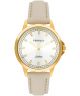 Zegarek damski Perfect PF00862 z serii Classic to model z kopertą wykonaną ze stali szlachetnej w kolorze złotym o szerokości 35 mm. Tarcza zegarka ma srebrny kolor i jest przykryta mineralnym szkłem. W zegarku zastosowano mechanizm kwarcowy MIYOTA 2035. Pasek jest skórzany, w beżowym kolorze, co tworzy delikatne połączenie z kopertą. Zegarek ma wodoszczelność 30 m, co pozwala na ochronę przed niewielkimi zachlapaniami. Model ten łączy prostotę i funkcjonalność, oferując klasyczny wygląd i wygodę noszenia.