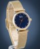 Damski zegarek Pierre Ricaud Fashion P22036.1145Q pracuje na japońskim mechanizmie kwarcowym, umieszczonym w złotej kopercie ze stali. Klasy dodaje całości dekoracyjne zdobienie szlifem słonecznym i kryształkami. Modny projekt podkreśla niebieska tarcza oraz bransoleta mesh.