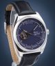 Pierre Ricaud Open Heart Automatic P60052.5265A to elegancki męski zegarek, który łączy klasyczny styl z nowoczesną technologią. Koperta wykonana ze stali szlachetnej w srebrnym kolorze harmonizuje z granatową tarczą typu open-heart, ozdobioną subtelnym fakturowaniem. Zegarek napędzany jest japońskim mechanizmem Seiko NH35, który posiada 24 kamienie łożyskowe i 41-godzinną rezerwę chodu, zapewniając precyzyjne działanie. Czarny skórzany pasek dodaje elegancji i komfortu noszenia. Szafirowe szkło chroni tarczę przed zarysowaniami, a przezroczysty dekiel pozwala podziwiać pracę mechanizmu. Zegarek posiada wodoszczelność do 50 metrów i jest idealnym wyborem dla mężczyzn ceniących wysoką jakość i niezawodność.