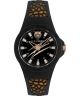 Zegarek Plein Sport PSBBA0123 z kolekcji Thunderstorm to model dla osób, które lubią wyróżniające się i modne dodatki. Produkt składa się z koperty z poliwęglanu i silikonowego paska – obie części są w czarnym uniwersalnym kolorze. Ciemną stylistykę przełamują różowozłote detale. Całość dopełnia tarcza w tym samym odcieniu ze wzorem imitującym zarysowania i głową tygrysa na godzinie 12. Praca zegarka bazuje na japońskim kwarcowym mechanizmie Seiko.