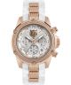 Plein Sport Hurricane PSDBA0723 to zegarek, który sprawdzi się zarówno na damskim, jak i męskim nadgarstku. Ozdobioną głową tygrysa tarczę z praktycznymi funkcjami (datownik dni miesiąca oraz chronograf) zabezpieczono szkiełkiem mineralnym. Koperta ze stali szlachetnej pokryta powłoką IP w odcieniu różowego złota jest połączona z wygodnym, białym paskiem z silikonu (materiał ten szczególnie łatwo utrzymać w czystości).