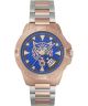 Stylowy zegarek Plein Sport Touchdown PSFBA1223 to casualowy dodatek do męskiej garderoby. Do wykonania koperty i bransolety modelu użyto stali szlachetnej o srebrno-złotej kolorystyce. Pod szkłem mineralnym znajdziemy niebieską tarczę z datownikiem dni miesiąca, ozdobioną motywem tygrysa. Poprawne działanie całości zapewnia mechanizm kwarcowy Seiko VJ52B. Wodoszczelność produktu liczy 50 metrów.