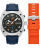 Police Portland Dual Time SET PEWGF00814X0 to męski zegarek oferowany w zestawie z dodatkowym pomarańczowym paskiem gumowym, co czyni go również dobrym wyborem na prezent. Model wyposażono w funkcję Dual Time, dzięki której można odczytywać czas w dwóch strefach jednocześnie. Posiada srebrną kopertę ze stali szlachetnej, szarą tarczę oraz niebieski pasek skórzany. Tarczę chroni mineralne szkło, a o działanie zegarka dba mechanizm kwarcowy VX9N. Wodoszczelność na poziomie 50 metrów chroni model przed zachlapaniami.