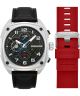 Police Portland Dual Time Set PEWGF00814X1 to męski zegarek kwarcowy sprzedawany w zestawie z dodatkowym czerwonym paskiem gumowym, który pozwala szybko zmienić charakter modelu. Srebrna koperta ze stali szlachetnej została połączona z szarą tarczą i czarnym paskiem skórzanym. Zegarek chroni szkło mineralne, a mechanizm VX9N oferuje funkcję Dual Time. Wodoszczelność na poziomie 50 metrów oznacza odporność na niewielkie zachlapania.