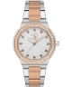 Zegarek damski Santa Barbara Unique SB.1.10552-5 to model z mechanizmem kwarcowym, utrzymany w eleganckiej, dwutonowej stylistyce. Koperta ze stali szlachetnej w kolorze srebrno-złotym została zestawiona z bransoletą w tej samej tonacji, tworząc spójną i wyważoną kompozycję. Srebrna tarcza o fakturowanej powierzchni została ozdobiona kryształkami oraz dekoracyjnymi indeksami, które nadają modelowi bardziej wyrazisty, biżuteryjny charakter. Koperta o szerokości 35 mm podkreśla subtelne proporcje modelu i dobrze układa się na nadgarstku. Za ochronę tarczy odpowiada szkło mineralne. Wodoszczelność na poziomie 50 metrów oznacza odporność na zachlapania, intensywny deszcz oraz krótkotrwały kontakt z wodą.