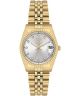 Zegarek damski Santa Barbara Unique SB.4.10034-2 to elegancki model w złotej odsłonie o biżuteryjnym charakterze. Koperta ze stali szlachetnej o szerokości 31 mm prezentuje się stylowo i kobieco na nadgarstku, a dopasowana bransoleta w tym samym kolorze tworzy spójną całość. Srebrna tarcza została wykończona szlifem słonecznym, który subtelnie odbija światło, a kryształki nadają jej delikatnego blasku. Na cyferblacie umieszczono datownik dnia miesiąca w formie okienka, co zwiększa funkcjonalność modelu. Mineralne szkiełko osłania tarczę przed działaniem czynników zewnętrznych. Produkt działa w oparciu o mechanizm kwarcowy. Wodoszczelność 30 metrów oznacza, że model jest odporny na małe zachlapania.