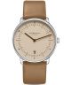 Zegarek Sternglas Naos Bauhaus S01-NA54-PR01 to minimalistyczny model inspirowany estetyką Bauhausu, zaprojektowany z naciskiem na prostą formę i czytelność. Koperta ze stali szlachetnej 316L w srebrnym kolorze ma szerokość 38 mm i bardzo smukły profil o grubości 6 mm, dzięki czemu całość prezentuje się lekko na nadgarstku. Beżowa tarcza została zabezpieczona wypukłym szkłem szafirowym z powłoką antyrefleksyjną. Za działanie zegarka odpowiada mechanizm kwarcowy Miyota GR12, a datownik dni miesiąca w formie okienka zwiększa funkcjonalność na co dzień. Model został wyposażony w brązowy pasek ze skóry cielęcej, który uzupełnia klasyczny charakter modelu. Wodoszczelność na poziomie 50 metrów chroni model przed zachlapaniami i krótkotrwałym kontaktem z wodą.