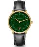 Zegarek męski Sternglas Naos S01-NAN41-BR04 to interesujący wybór dla miłośników nowoczesnego designu. Posiada kopertę w kolorze złotym wykonaną z wysokiej jakości stali szlachetnej, co zapewnia solidność i elegancję. Zielona tarcza, zdobiona awenturynem, przyciąga wzrok i nadaje zegarkowi unikalnego charakteru. Tarcza jest przykryta szkiełkiem szafirowym, co chroni ją przed zarysowaniami. Czarny skórzany pasek świetnie komponuje się z całością i dodaje komfortu noszenia. Szerokość koperty wynosząca 38 mm sprawia, że zegarek prezentuje się zgrabnie na nadgarstku. Zegarek ma wodoszczelność 50 m, co oznacza, że dobrze znosi kontakt z wodą w codziennym użytkowaniu. To propozycja dla panów ceniących sobie styl oraz funkcjonalność.