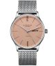 Zegarek męski Sternglas Berlin Automatic S02-BE56-MI04 łączy beżowy cyferblat ze srebrną kopertą wykonaną ze stali szlachetnej 316L oraz bransoletą mesh o szerokości 20 mm, tworząc spójną i minimalistyczną kompozycję. Koperta mierzy 38 mm szerokości i 12 mm grubości, co nadaje modelowi wyważony profil. Tarczę pokrywa wypukłe szkło szafirowe z antyrefleksem, które chroni ją przed działaniem czynników zewnętrznych. Wskazanie day-date umożliwia wygodny odczyt dnia tygodnia i miesiąca bezpośrednio z cyferblatu. Przeszklony dekiel odsłania mechanizm Miyota 8205 wyposażony w 21 kamieni oraz 42-godzinną rezerwę chodu, w oparciu o który zegarek działa. Wodoszczelność na poziomie 50 metrów pozwala na krótkotrwały kontakt z wodą oraz większe zachlapania.
