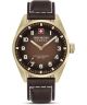 Swiss Military Hanowa Greyhound SMWGA0001551 to zegarek dla mężczyzn preferujących eleganckie połączenia kolorystyczne. Złota koperta i brązowa tarcza zestawione zostały z brązowym paskiem wykonanym ze skóry. Model napędzany jest przez szwajcarski mechanizm kwarcowy Ronda 503 i wyposażony w szafirowe szkiełko. Wodoszczelność na poziomie 100 metrów umożliwia pływanie z zegarkiem na nadgarstku.