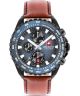 Zegarek męski Swiss Military Hanowa Stone Marten Chronograph SMWGC0001831 to model z funkcją stopera, zaprojektowany w oparciu o rozbudowaną specyfikację i wyrazistą formę koperty. Czarna koperta ze stali szlachetnej ma szerokość 45 mm i grubość 11 mm, a całość zestawiono z brązowym paskiem skórzanym o szerokości 22 mm. Niebieska tarcza o fakturowanej powierzchni została wyposażona w chronograf, datownik dni miesiąca umieszczony w okienku oraz skalę tachymetru, umożliwiającą pomiar prędkości na określonym dystansie. Za działanie zegarka odpowiada mechanizm kwarcowy Swiss Made Ronda 3540.D. Tarcza chroniona jest wysokiej jakości szkłem szafirowym, a zakręcany dekiel stanowi element konstrukcji koperty. Wodoszczelność na poziomie 100 metrów pozwala na pływanie powierzchniowe oraz rekreacyjny kontakt z wodą.