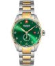 Zegarek męski Swiss Military Hanowa Lynx SMWGH0000760 to elegancki model utrzymany w srebrno-złotej stylistyce. Koperta ze stali szlachetnej IP o szerokości 42 mm i grubości 11 mm została zestawiona z bransoletą w tym samym kolorze i o szerokości 21 mm. Zielony cyferblat z cyframi arabskimi został osłonięty szafirowym szkiełkiem z antyrefleksem, które chroni powierzchnię przed działaniem czynników zewnętrznych. Na tarczy umieszczono subtarcze sekundnika oraz datownik dni miesiąca w formie okienka. Urządzenie działa w oparciu o kwarcowy mechanizm Ronda 6004.D. Konstrukcję dopełnia zakręcany dekiel. Wodoszczelność 100 m pozwala na pływanie powierzchniowe.