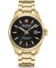 Swiss Military Hanowa Pioneer SMWGH0004110 to zegarek męski napędzany mechanizmem kwarcowym Swiss Made Ronda 515. Model łączy czarną tarczę z kopertą i bransoletą ze stali szlachetnej w złotym kolorze, co nadaje mu wyrazisty charakter. Tarcza została zabezpieczona szafirowym szkłem, a wodoszczelność na poziomie 100 metrów pozwala na bezpieczne użytkowanie zegarka także podczas pływania.