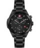 Zegarek męski Swiss Military Hanowa Chiroptera Night Vision Chronograph SMWGI0001930 to propozycja dla osób poszukujących zegarka o jednolitej kolorystyce i rozbudowanych funkcjach pomiaru czasu. Model pracuje w oparciu o mechanizm kwarcowy Swiss Made i oferuje chronograf oraz datownik dni miesiąca, przydatne w codziennym użytkowaniu. Czarna koperta ze stali szlachetnej została zestawiona z czarną tarczą oraz szkłem szafirowym, zabezpieczającym cyferblat. Stalowa bransoleta o szerokości 20 mm dopełnia całość i zapewnia spójny wygląd konstrukcji. Zakręcany dekiel wspiera szczelność obudowy, a masa luminescencyjna pomaga zachować czytelność w warunkach słabego oświetlenia. Wodoszczelność na poziomie 100 metrów oznacza możliwość pływania powierzchniowego, bez nurkowania z akwalungiem.