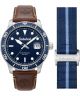 Timberland Peatfield SET TDWGB00834X1 to zestaw z dodatkowym materiałowym paskiem w kolorze niebieskim, który pozwala dopasować zegarek do różnych okazji. Model ma srebrną kopertę z aluminium i stali szlachetnej, niebieską tarczę z datownikiem oraz brązowy pasek ze skóry. Mineralne szkło chroni tarczę, a wodoszczelność 50 m zabezpiecza zegarek przed codziennym kontaktem z wodą.