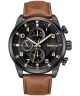 Timberland Henniker II TBL.TDWGF2201102 to męski zegarek, który łączy surowy styl outdoorowy z funkcjonalnością codziennego dodatku. Wyposażony w sprawdzony mechanizm kwarcowy, model ten gwarantuje niezawodne działanie, a dzięki uniwersalnej kolorystyce świetnie sprawdzi się zarówno na co dzień, jak i w bardziej casualowych stylizacjach. Koperta zegarka została wykonana z odpornej na korozję stali szlachetnej, pokrytej trwałą powłoką IP w kolorze czarnym. Ma ona średnicę 46 mm i zamyka się od spodu zakręcanym deklem, co poprawia szczelność konstrukcji. Wodoszczelność na poziomie 50 metrów (5 ATM) pozwala na użytkowanie zegarka podczas mycia rąk, w deszczu czy pod prysznicem. Czarna tarcza, osłonięta mineralnym szkłem, została wzbogacona o trzy funkcjonalne totalizatory: datownika dnia miesiąca, dnia tygodnia oraz wskaźnika czasu 12/24h. Indeksy oraz wskazówki pokryto powłoką luminescencyjną, co zwiększa czytelność zegarka w słabym świetle. Całość zamocowano na brązowym pasku ze skóry naturalnej, wykończonym klasyczną sprzączką. Pasek o szerokości 24 mm jest miękki, wygodny i dobrze układa się na nadgarstku, podkreślając outdoorowy charakter modelu. Zegarek posiada również możliwość wyboru formatu godziny – 12-godzinny z rozróżnieniem AM/PM lub 24-godzinny. Dzięki temu można dopasować go do własnych preferencji.