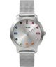 Zegarek damski Timex Main Street TW2Y48600 to propozycja dla kobiet, które szukają eleganckiego modelu w klasycznej, srebrnej odsłonie. Koperta w kolorze srebrnym została wykonana z metalu i wykończona polerowaniem, a srebrny bezel podkreśla spójność projektu. Srebrna tarcza z efektem szlifu słonecznego została ozdobiona cyrkoniami oraz liniowymi indeksami, co nadaje jej dekoracyjny, uporządkowany wygląd. Model wyposażono w bransoletę typu mesh ze stali szlachetnej w kolorze srebrnym, która dobrze układa się na nadgarstku i podkreśla klasyczny styl zegarka. Za działanie zegarka odpowiada japoński mechanizm kwarcowy. Za ochronę tarczy odpowiada szkło mineralne. Wodoszczelność na poziomie 3 ATM oznacza odporność na niewielkie zachlapania, na przykład podczas mycia rąk.