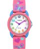 Zegarek dziecięcy Timex Kids Time Teacher TW2Y59700 został przygotowany z myślą o dzieciach uczących się odczytywania godziny. Koperta w niebieskim kolorze wykonana z tworzywa została połączona z różowym silikonowym paskiem, który dobrze dopasowuje się do nadgarstka. Biała tarcza została wyposażona w duże cyfry arabskie ułatwiające szybkie rozpoznanie wskazań. Całość uzupełnia różowy pierścień wokół cyferblatu, który nadaje modelowi wyrazisty, dziecięcy charakter. Tarczę pokrywa szkło hesalitowe chroniące ją przed działaniem czynników zewnętrznych. Zegarek działa w oparciu o japoński mechanizm kwarcowy. Wodoszczelność na poziomie 30 metrów oznacza odporność na drobne zachlapania, na przykład podczas mycia rąk czy w czasie niewielkiego deszczu.