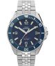 Zegarek męski Timex Deep Water Arctic TW2Y64600 to model o wyraźnie sportowym charakterze, zaprojektowany z myślą o użytkowaniu w środowisku wodnym. Koperta o szerokości 40,5 mm została wykonana ze stali szlachetnej i wykończona połączeniem szczotkowania oraz piaskowania, co nadaje jej techniczny, surowy wygląd. Niebieska tarcza łączy cyfry arabskie z indeksami liniowymi, tworząc czytelny i uporządkowany układ wskazań. Za działanie zegarka odpowiada japoński mechanizm kwarcowy. Model wyposażono w stalową bransoletę w srebrnym kolorze, spójną stylistycznie z kopertą. Tarcza zabezpieczona jest szkłem szafirowym. Ceramiczny pierścień wokół tarczy podkreśla sportowy charakter konstrukcji. Wodoszczelność na poziomie 200 metrów pozwala na pływanie oraz nurkowanie z akwalungiem.