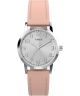 Zegarek damski Timex Main Street TW2Y67000 to subtelny model o klasycznym charakterze, który dobrze sprawdza się jako codzienny dodatek. Srebrna koperta wykonana z metalu o szerokości 30 mm i smukłej grubości 7 mm prezentuje się lekko i została zestawiona z różowym, skórzanym paskiem o szerokości 16 mm. Srebrny cyferblat z czytelnymi cyframi arabskimi podkreśla elegancką prostotę projektu, a polerowane wykończenie koperty dodaje całości estetycznego blasku. Tarcza została osłonięta mineralnym szkiełkiem, które pełni funkcję ochronną. Model działa w oparciu o kwarcowy mechanizm japoński. Wodoszczelność 30 metrów oznacza odporność na drobne zachlapania, na przykład podczas mycia rąk lub w czasie niewielkiego deszczu.
