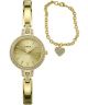 Zegarek damski Timex Trend Aveline Set TWG067900 dostępny jest w zestawie z dodatkową bransoletką, dzięki czemu stanowi atrakcyjną propozycję na prezent. Koperta wykonana z metalu w kolorze złotym o polerowanym wykończeniu została ozdobiona cyrkoniami, które podkreślają biżuteryjny charakter modelu. Złota tarcza z efektem szlifu słonecznego i liniowymi indeksami zapewnia czytelny układ wskazań oraz spójność stylistyczną. Model wyposażono w złotą bransoletę, która dobrze leży na nadgarstku i harmonizuje z kopertą. Za działanie zegarka odpowiada japoński mechanizm kwarcowy. Za ochronę tarczy odpowiada szkło mineralne. Wodoszczelność na poziomie 3 ATM oznacza odporność na niewielkie zachlapania, na przykład podczas mycia rąk.