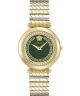 Zegarek damski Versace Delphinus VE0O00225 to połączenie klasyki i elegancji, które doskonale odzwierciedla charakter włoskiej marki. Koperta o średnicy 35 mm została wykonana ze stali szlachetnej 316L, a jej powierzchnia została starannie wypolerowana. Złoty bezel harmonijnie kontrastuje z chłodnym odcieniem srebra, podkreślając biżuteryjny styl modelu. Bransoleta w kolorze srebrno-złotym dodaje całości wyrafinowanego wyglądu. Wewnątrz zegarka pracuje mechanizm kwarcowy, a szafirowe szkło zapewnia wysoką odporność na zarysowania. Zakręcany dekiel zwiększa szczelność konstrukcji, a wodoszczelność na poziomie 50 metrów chroni zegarek przed niewielkim kontaktem z wodą.