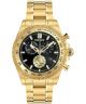 Zegarek męski Versace Chrono X 45 mm VE9K00524 to model łączący sportowy styl z elegancją. Koperta zegarka wykonana jest ze stali szlachetnej w kolorze złotym, co nadaje mu luksusowego charakteru. Czarna tarcza, na której znajdują się złote elementy, jest przykryta szkłem szafirowym, co zapewnia estetyczny wygląd. Bransoleta, również w kolorze złotym, wykonana z wysokiej jakości stali szlachetnej doskonale komponuje się z całością. Zegarek posiada wodoszczelność do 50 m, dzięki czemu jest odporny na zachlapania, np. podczas kąpania się w wannie. Model jest napędzany mechanizmem kwarcowym Swiss Made, posiada także chronograf, tachymetr oraz datownik.