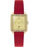 Zegarek damski Yema Radiance YMHF1587-1EL to elegancki model o wyrazistym, biżuteryjnym charakterze. Złota koperta ze stali szlachetnej IP o szerokości 24 mm i grubości 6 mm została połączona ze skórzanym paskiem w czerwonym kolorze o szerokości 14 mm. Złoty cyferblat o fakturowanej powierzchni osłania szafirowe szkiełko, które chroni tarczę przed działaniem czynników zewnętrznych. Polerowane wykończenie koperty podkreśla elegancki styl produktu. Model działa w oparciu o kwarcowy mechanizm Ronda 1062. Wodoszczelność 30 m oznacza odporność na drobne zachlapania, na przykład podczas mycia rąk lub w czasie niewielkiego deszczu.