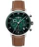Zegarek męski Zeppelin Hindenburg Solar 8086-4_N to elegancki model o zielonej, bioceramicznej tarczy, która doskonale współgra z brązowym paskiem ze skóry wegańskiej. Model opiera swoje działanie o japoński mechanizm solarny Seiko VR42 ze wskaźnikiem rezerwy chodu. Cyferblat dodatkowo uzupełniają datownik dni miesiąca i chronograf, a przed uszkodzeniami zabezpieczono go utwardzanym szkiełkiem mineralnym K1. Srebrną kopertę wykonano ze stali szlachetnej.