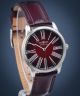 Damski Zeppelin Flatline 8345-5 to tradycyjny lotniczy zegarek damski o pięknej wyrazistej kolorystyce czerwieni i brązu. Smukłą srebrną kopertę ze stali szlachetnej zestawiono ze skórzanym paskiem. Ponadczasowy projekt wzbogacono o czytelne strzeliste indeksy rzymskie. W obudowie umieszczono szwajcarski mechanizm kwarcowy Ronda 715 z funkcją daty.