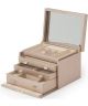 Eleganckie pudełko Wolf Palermo duże 213016. Wykonane z wysokiej jakości skóry naturalnej. Zapięcie na kluczyk zapewnia bezpieczne przechowywanie. Model posiada 3 rolki na pierścionki, 15 przegródek na drobiazgi oraz 2 przegródki na zegarki. Idealne miejsce do przechowywania i prezentacji swojej kolekcji zegarków i biżuterii.