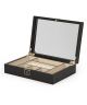 Eleganckie pudełko na zegarki Wolf Palermo średnie 213202. Wykonane z naturalnej skóry, wyposażone w zapięcie na kluczyk. Posiada 4 rolki na pierścionki oraz 6 przegródek na drobne akcesoria. Wewnątrz umiejscowiono także lusterko.