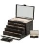 Pudełko Wolf Caroline 329571 to bardzo duża szkatułka, której obicie wykonano z naturalnej skóry. Posiada zapięcie na kluczyk. W środku znajdują się 43 przegródki na biżuterię, 4 przegródki na zegarki, 4 rolki na pierścionki oraz wyjmowana rolka podróżna na biżuterię, która ma 2 przegródki, 10 dziurek na kolczyki, 3 uchwyty na naszyjniki i 1 pasek na pierścionki. W komplecie dostajesz również etui podróżne, które ma 3 przegródki i 4 rolki na pierścionki.