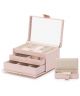Pudełko Wolf Caroline 329715 to średnia szkatułka, której obicie zostało wykonane z naturalnej skóry ozdobionej pikowaniem. Model wyposażono w zapięcie na kluczyk, 15 przegródek na drobne akcesoria, 7 rolek na pierścionki, oraz wyjmowane etui podróżne z 3 przegródkami i 4 rolkami na pierścionki.