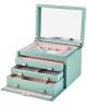 Pudełko na biżuterię Wolf x Liberty Julia Interior Print Sage 381051 w rozmiarze L to stylowy organizer zaprojektowany z myślą o przechowywaniu większej kolekcji biżuterii. Model utrzymano w eleganckiej zielonej kolorystyce, a wnętrze zdobi charakterystyczny nadruk Liberty Julia – delikatny kwiatowy motyw wywodzący się z projektu z lat 30. XX wieku, przygotowany w specjalnej wersji kolorystycznej dla WOLF. Konstrukcję wykonano z materiału pochodzenia biologicznego, natomiast wnętrze pokryto ultrasuede z technologią LusterLoc™, która wspiera ochronę biżuterii przed utratą blasku. W środku znajdują się 15 przegródek na różne elementy biżuterii, 3 wałki na pierścionki oraz 2 poduszki przeznaczone na zegarki. Całość zamykana jest na kluczyk.