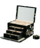 Wolf Zoe 393012 to luksusowe pudełko na biżuterię w rozmiarze L, zaprojektowane z myślą o przechowywaniu różnorodnych akcesoriów w elegancki i zorganizowany sposób. Pokryte miękkim, zielonym aksamitem i ozdobione delikatnym haftem z motywem kwiatowym, wyróżnia się subtelną estetyką i dbałością o detale. Wnętrze wyposażone w technologię LusterLoc™ chroni biżuterię przed matowieniem do 35 lat. Praktyczny układ obejmuje: 18 rolek na pierścionki, 12 haczyków na naszyjniki, 5 przegródek na bransoletki, 6 mankietów na bransoletki lub zegarki oraz wyjmowany mini organizer podróżny, idealny na wyjazdy. Zapięcie na kłódkę zapewnia bezpieczeństwo przechowywanych przedmiotów, czyniąc ten model nie tylko pięknym, ale i funkcjonalnym rozwiązaniem dla wymagających użytkowniczek.