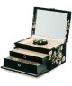 Pudełko Wolf Zoe 393112 w zielonym odcieniu to elegancka propozycja do przechowywania biżuterii, która łączy estetykę z praktyczną organizacją. Miękki aksamit został ozdobiony kwiatowym haftem, tworząc subtelną, kobiecą formę. Wnętrze wykończono tkaniną z technologią LusterLoc™, która chroni biżuterię przed matowieniem. Znalazło się tu miejsce na 10 małych komór, 4 średnie, 3 duże, a także 4 przegródki na bransoletki i 4 mankiety na zegarki lub większe ozdoby. Całość zamykana jest na kłódkę i wyposażona w wyjmowany organizer podróżny.