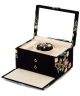 Granatowe pudełko Wolf Zoe 393116 to kompaktowa i elegancka propozycja dla kobiet, które cenią stylowe rozwiązania do przechowywania biżuterii. Aksamitna powierzchnia ozdobiona haftem florystycznym podkreśla jego subtelny wygląd, a zamknięcie na kłódkę zwiększa bezpieczeństwo przechowywanych dodatków. Wnętrze z technologią LusterLoc™ mieści liczne przegródki – 10 małych, 4 średnie i 3 duże komory, miejsca na zegarki oraz wyjmowany mini element podróżny.