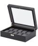 Wolf Viceroy 466102 to pudełko na zegarki o eleganckim, dekoracyjnym charakterze, wykonane z czarnej, wegańskiej skóry. Wyposażono je w zamykaną, szklaną pokrywę i zapięcie na kłódkę. Pomieści 10 zegarków o wymiarach obudowy do 52 mm każdy. Gwarancja obejmująca produkt wynosi 2 lata i jest ważna od daty zakupu.