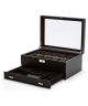 Wolf Axis 488216 to eleganckie pudełko na zegarki i biżuterię, z obiciem wykonanym z wysokiej jakości skóry wegańskiej. Posiada zapięcie na kluczyk, co zapewnia bezpieczeństwo przechowywanych przedmiotów. Model ma miejsce na 10 zegarków, jest wyposażony w 8 rolek na pierścionki, kolczyki czy spinki do krawata, 12 przegródek na spinki do mankietów, 2 przegródki na pasek oraz 1 kieszeń na bransoletkę. Dodatkowo znajduje się tu szufladka na monety, co sprawia, że pudełko jest praktyczne i funkcjonalne.