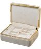 Wolf Bella 781053 to beżowe pudełko na biżuterię o eleganckim wyglądzie i przemyślanej konstrukcji. Klasyczne zamknięcie, złote okucia oraz plisowane boki z wegańskiej skóry z recyklingu nadają mu luksusowego charakteru. Wewnątrz znajdują się trzy wyjmowane tacki oraz funkcjonalna saszetka na zamek z przegrodą, umożliwiająca przechowywanie mniejszych elementów biżuterii. Wnętrze zostało wyściełane innowacyjnym materiałem LusterLoc™, który pomaga zachować naturalny połysk dodatków przez wiele lat.