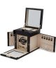 Rotomat Wolf Palermo 213702 jest ekskluzywnym urządzeniem z miejscem na jeden zegarek i biżuterię. W górnej części znajduje się schowek na zegarek wraz z 10 rolkami na pierścionki, a otwierane boki pomieszczą po 5 naszyjników z każdej strony. Rotomat wykonano z czarnej wegańskiej skóry i jasnego materiału. Model wyposażono w programy prawo/lewo oraz dwukierunkowy. Liczbę dziennych obrotów można regulować w zakresie 300-1200 TPD, da się także włączyć 10 sekund opóźnienia startu. Urządzenie ma wyświetlacz LCD oraz opcję ustawienia rezerwy chodu od 6 do 72 godzin. Opatentowany system blokujący osadza zegarek w bębnie rotomatu, zapewniając bezpieczne dopasowanie.