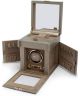 Rotomat Wolf Palermo 213778 został wykonany z jasnoszarej skóry. Do tego ma szklaną pokrywę i jest zamykany na kluczyk. Przeznaczony do przechowywania zegarków i biżuterii. Urządzenie ma wgrane programy prawo/lewo – dwukierunkowy, ilość obrotów wynosi od 300 do 1200 TPD (obrotów dziennie), ma też możliwość ustawienia rezerwy chodu od 6 do 72 godzin. Do tego rotomat wyposażono w podświetlany wyświetlacz LCD, schowek na jeden zegarek, 10 rolek na pierścionki oraz otwierane boczne części mogące pomieścić łącznie do 10 naszyjników.